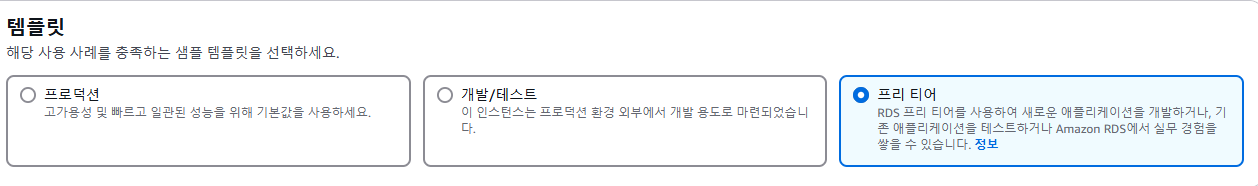 엔진옵션은 MySQL, 템플릿은 학습용이므로 프리티어를 선택합니다.