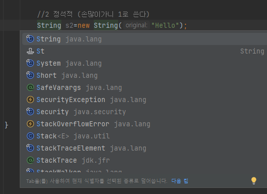 //2 String 생성자를 이용 (코드도 길고, 메모리관리에 적합하지 않아 1을 많이 쓴다)