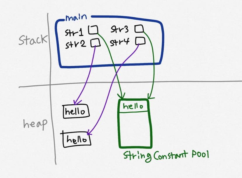 따라서 같은 리터럴로 생성된 문자열들은 동일한 메모리 주소를 참조하게 되어 메모리 효율성이 높다!