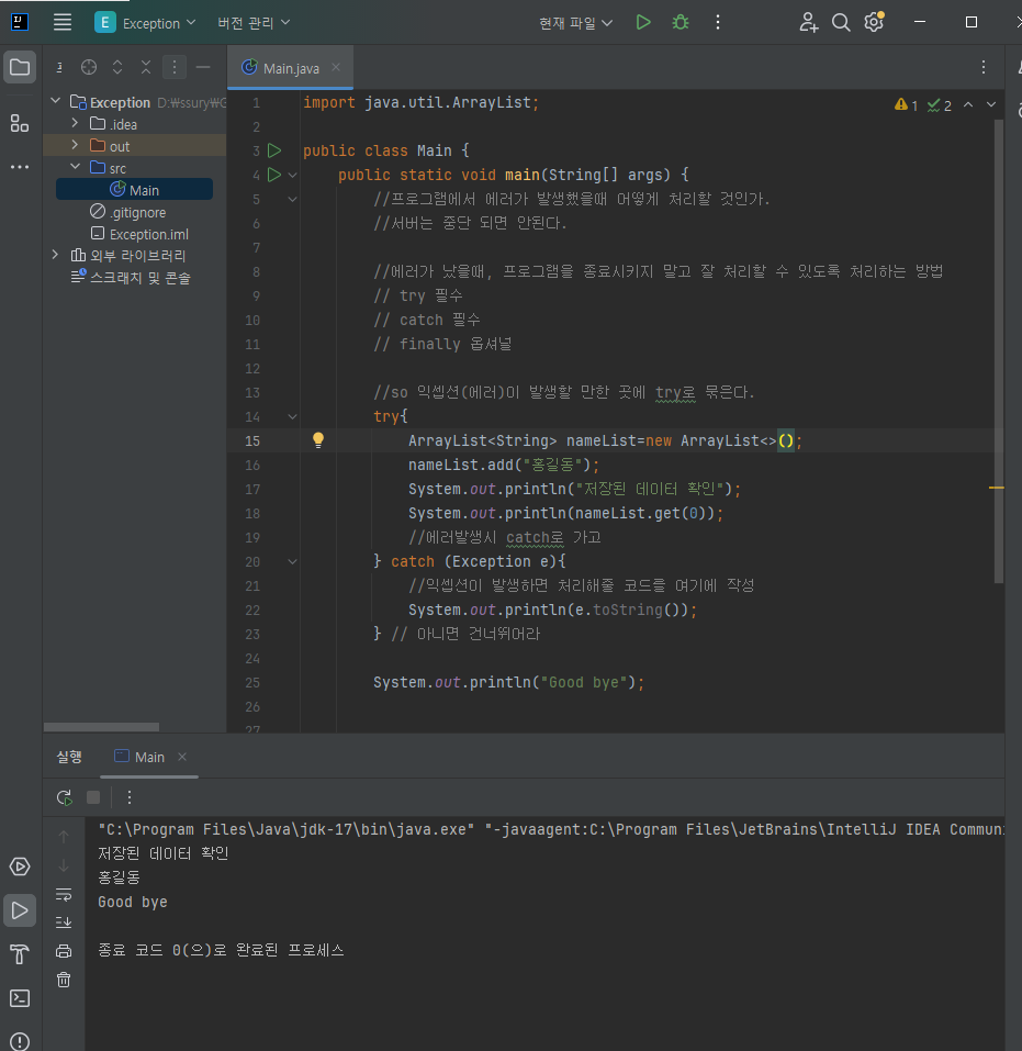 exception상황이 없었으므로 잘 처리되어 System.out.println() 함수들도 잘 동작 하였다.