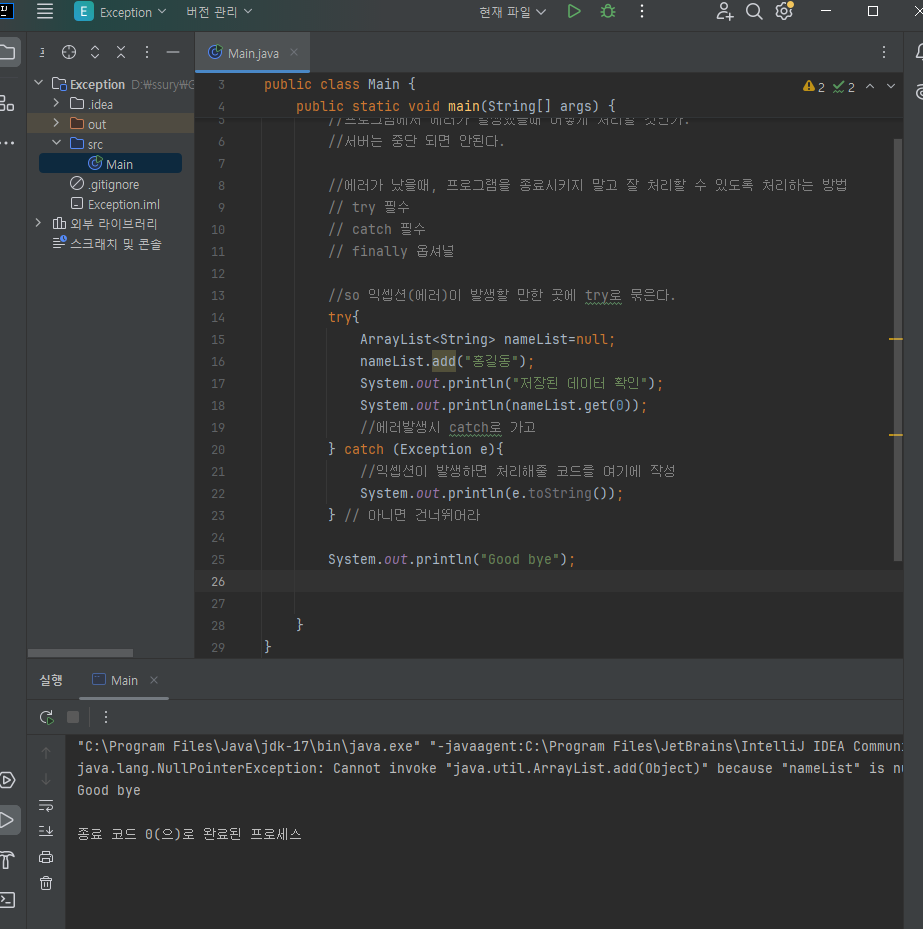 자바에서는 try-catch 문을 사용하여 이러한 예외를 처리할 수 있습니다.
