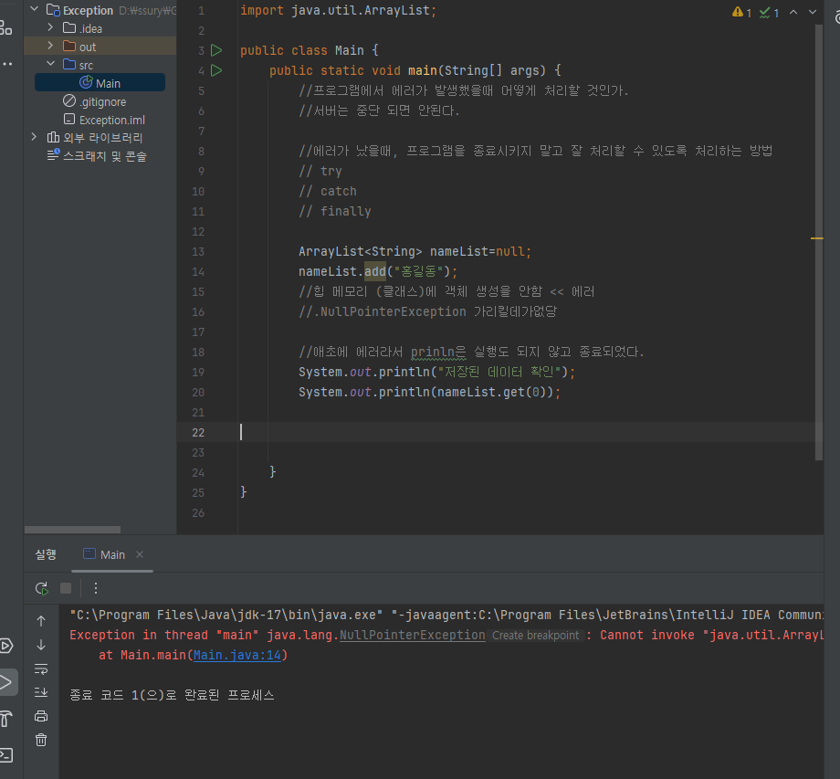 ArrayList 가 초기화되지 않았음. nameList는 null로 초기화 되어있음 = 어떤 객체도 가리키지 않음
