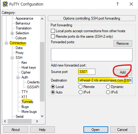 방금 yml 설정때 포트충돌을 피하기위해 3307로 우회했었다. 소스포트 3307, 목적지 3306 설정해주기.
