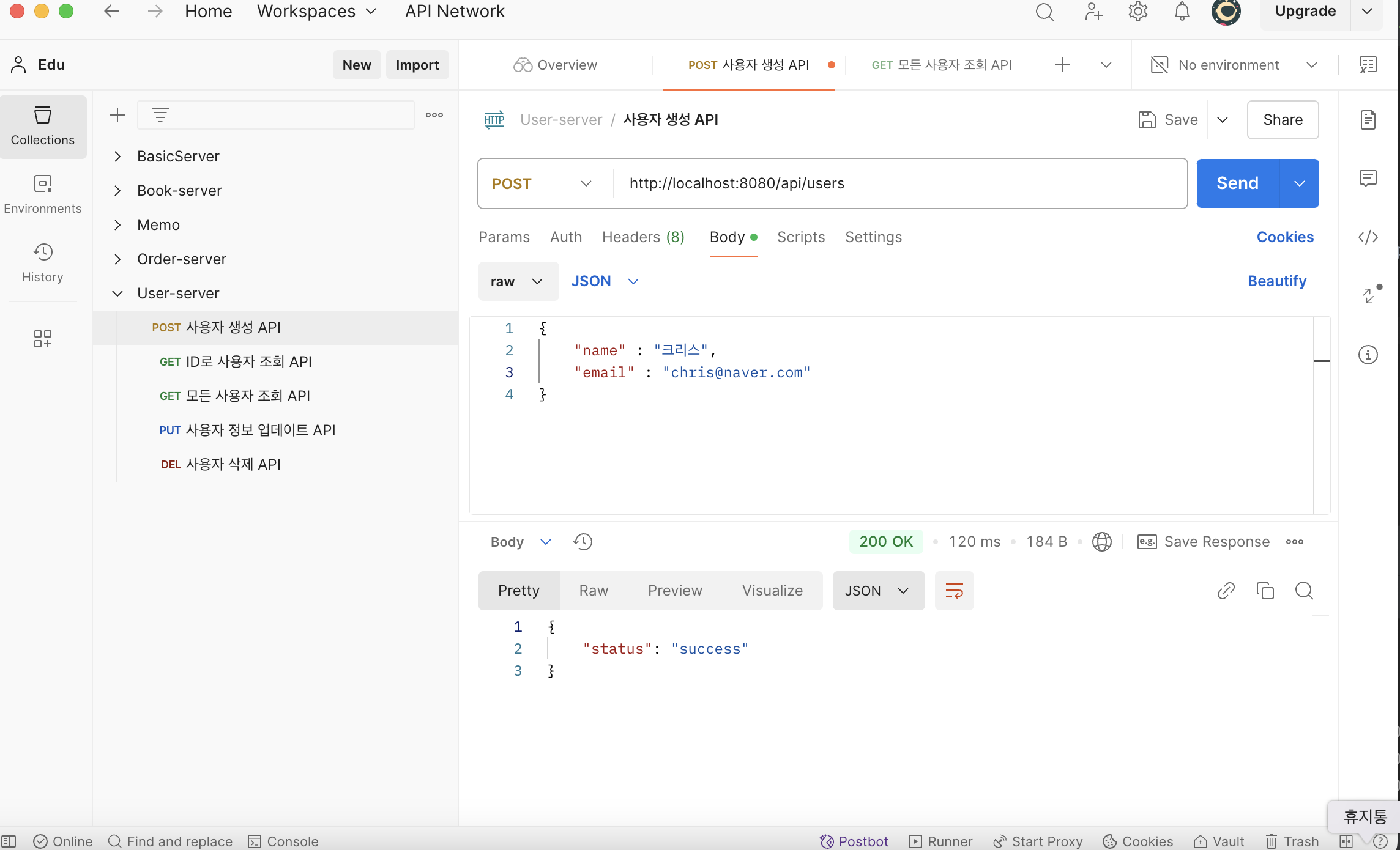 크리스의 이메일이 성공적으로 등록되어 status : seccess로 리스폰받음
