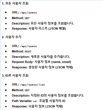 - 반환 값: 메서드의 반환 값은 자동으로 JSON 형식으로 변환되어 응답 본문에 포함됩니다.