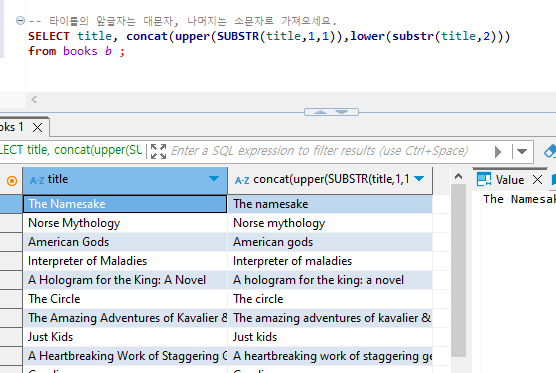 from books b ;앞 글자만 대문자로 변환하려면 concat과 substr을 응용합니다.