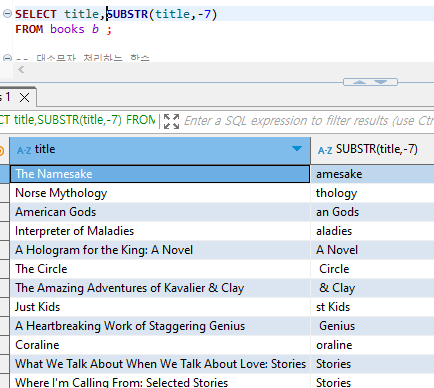 -- 책 제목을 맨 뒤 7번째 글자부터 끝까지 가져오세요.