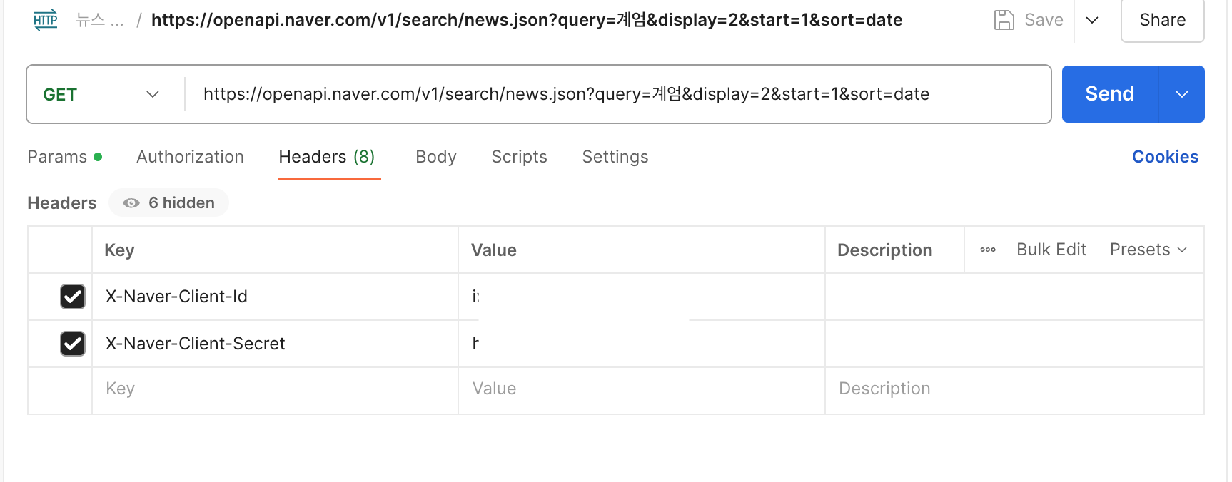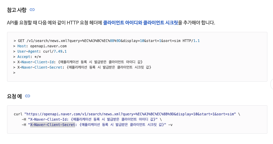// X-Naver-Client-Id: {애플리케이션 등록 시 발급받은 클라이언트 아이디 값}, X-Naver-Client-Secret: {애플리케이션 등록 시 발급받은 클라이언트 시크릿 값}