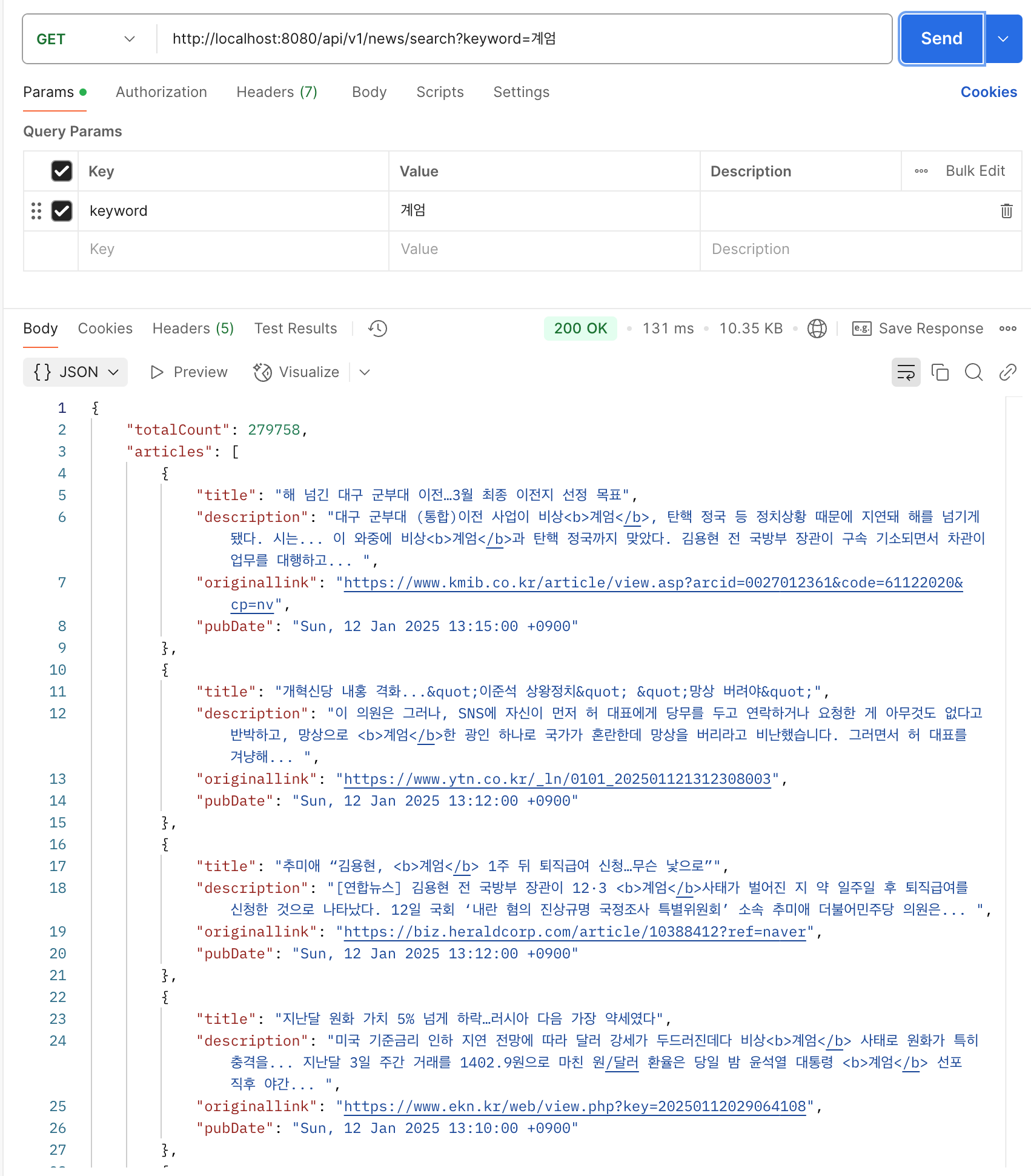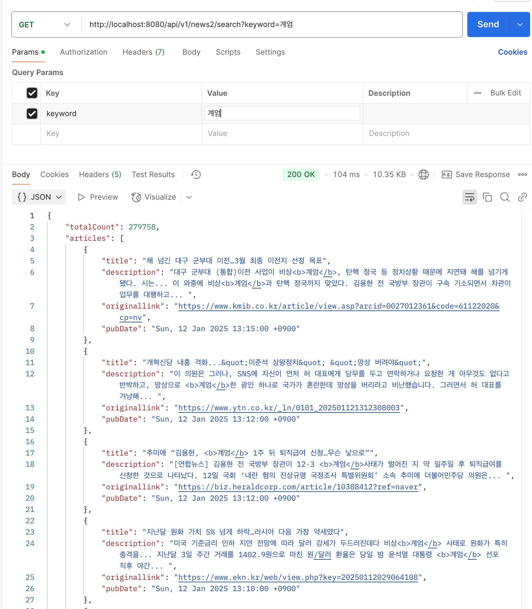NewsSearchResponse newsSearchResponse = newsService.getNews(keyword);