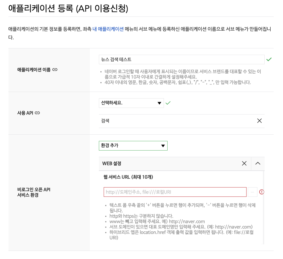 네이버 개발자 어플리케이션 등록하기