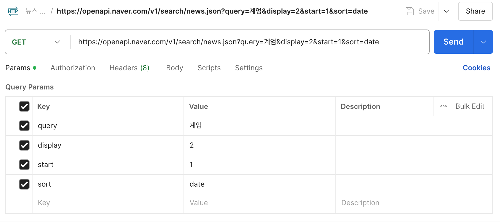 | sort | String | N | 검색 결과 정렬 방법 - sim: 정확도순으로 내림차순 정렬(기본값) - date: 날짜순으로 내림차순 정렬 |