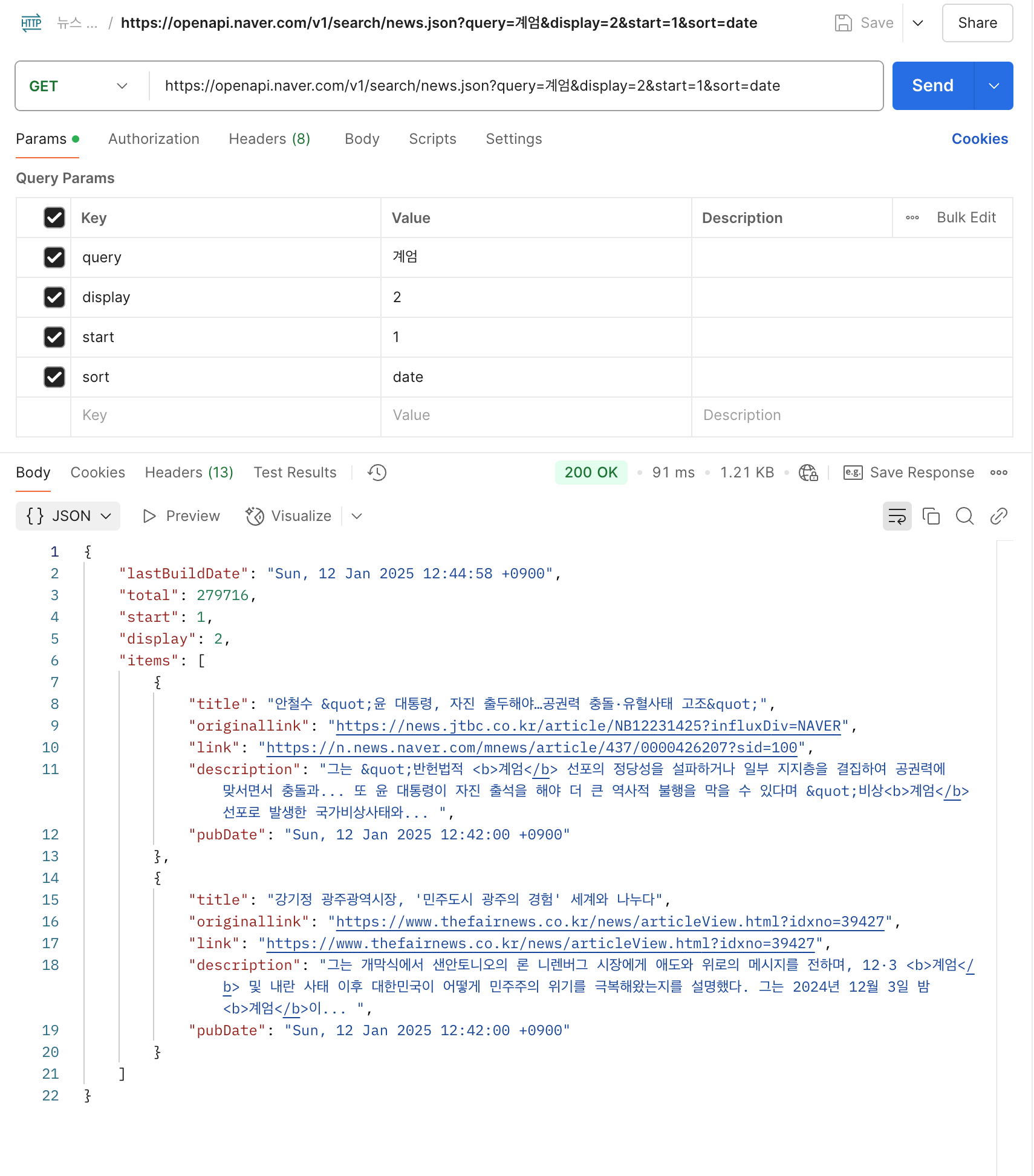 | sort | String | N | 검색 결과 정렬 방법 - sim: 정확도순으로 내림차순 정렬(기본값) - date: 날짜순으로 내림차순 정렬 |
