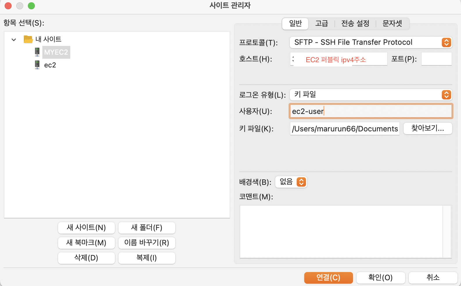 ssh -i ~/Documents/ssh키.pem ec2서버 유저네임 @ 퍼블릭 호스트