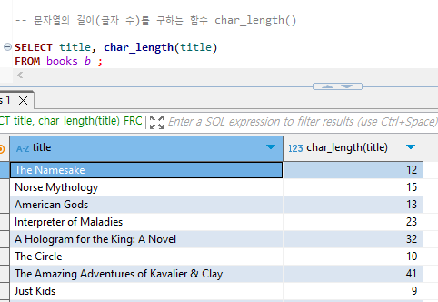 카테고리 없음 SQL char_length() 함수 by ssury94 2024. 11. 27. -- 문자열의 길이(글자 수)를 구하는 함수 char_length() Title의 공백을 포함한 문자열의 개수를 반환합니다. SELECT title, char_length(title) FROM books b ; 공유하기 게시글 관리 매일코딩