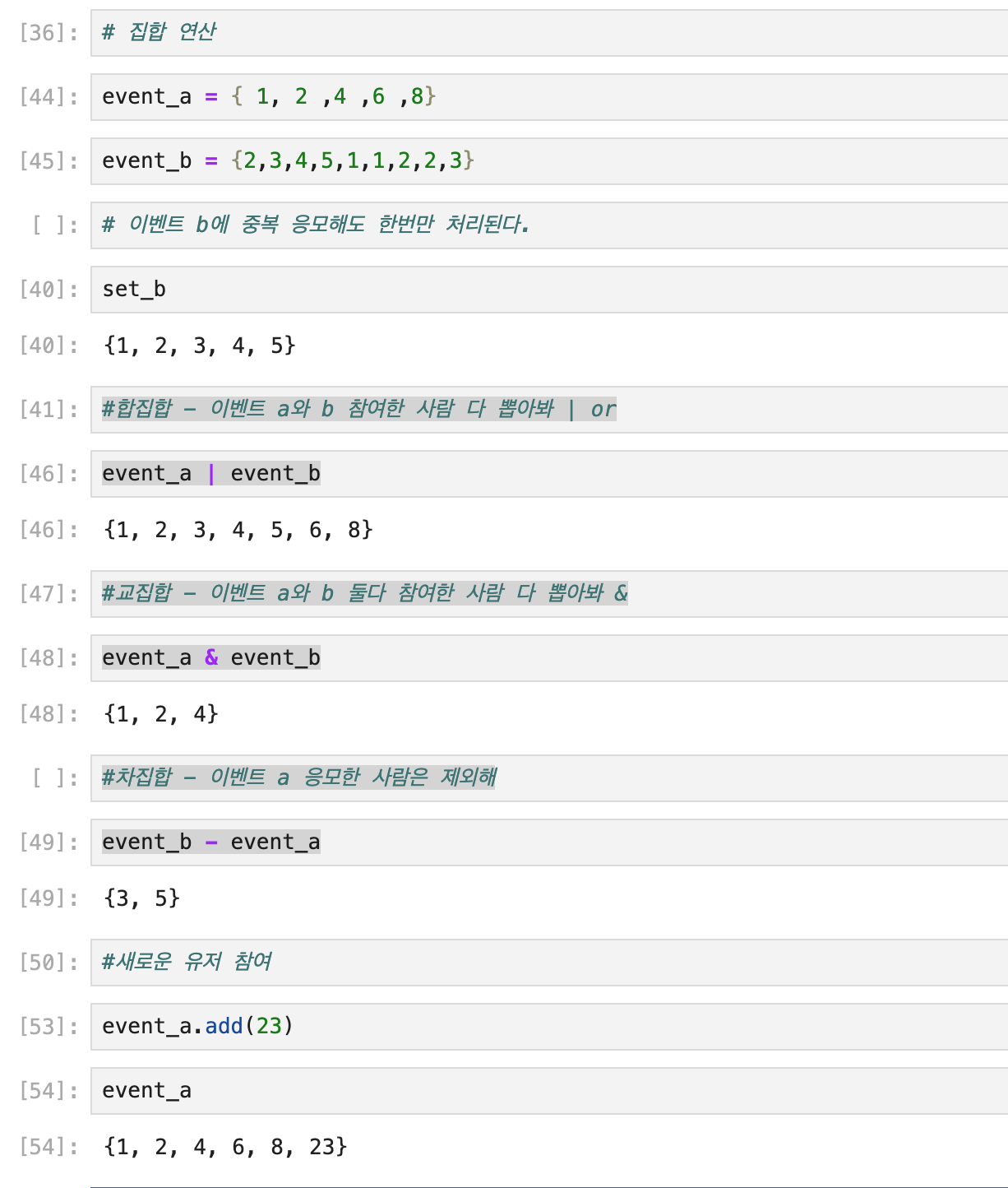 - 딕셔너리와 같이 중괄호 { }를 사용하지만, key:value의 한 쌍이 아닙니다.