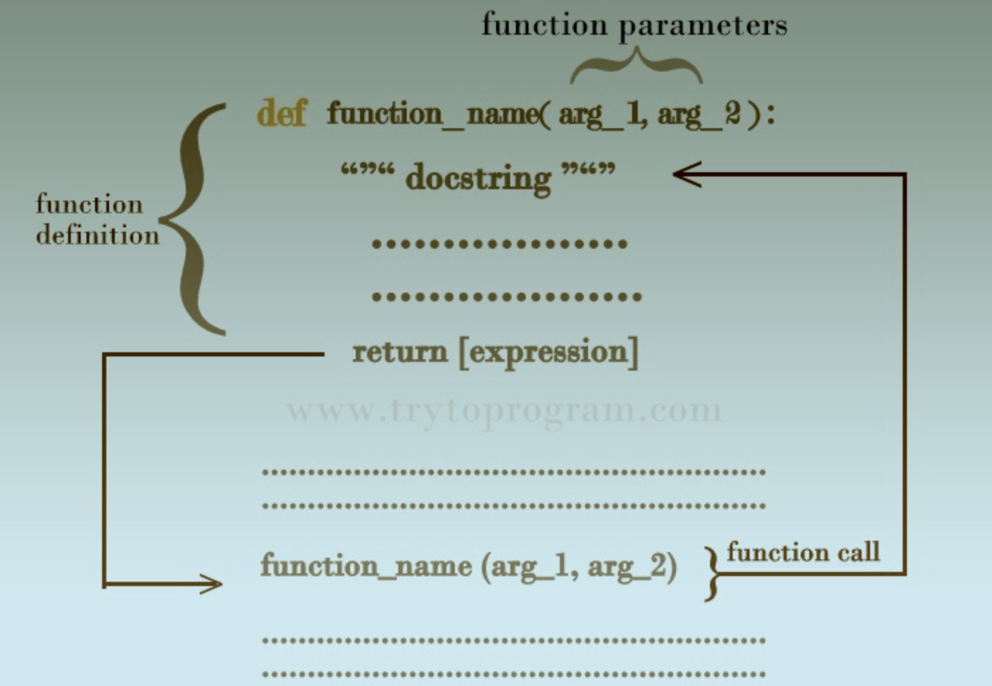 - 파라미터(Parameter): 함수가 호출될 때 받을 데이터를 정의하는 변수입니다. 함수 내부에서 이 데이터를 사용합니다.