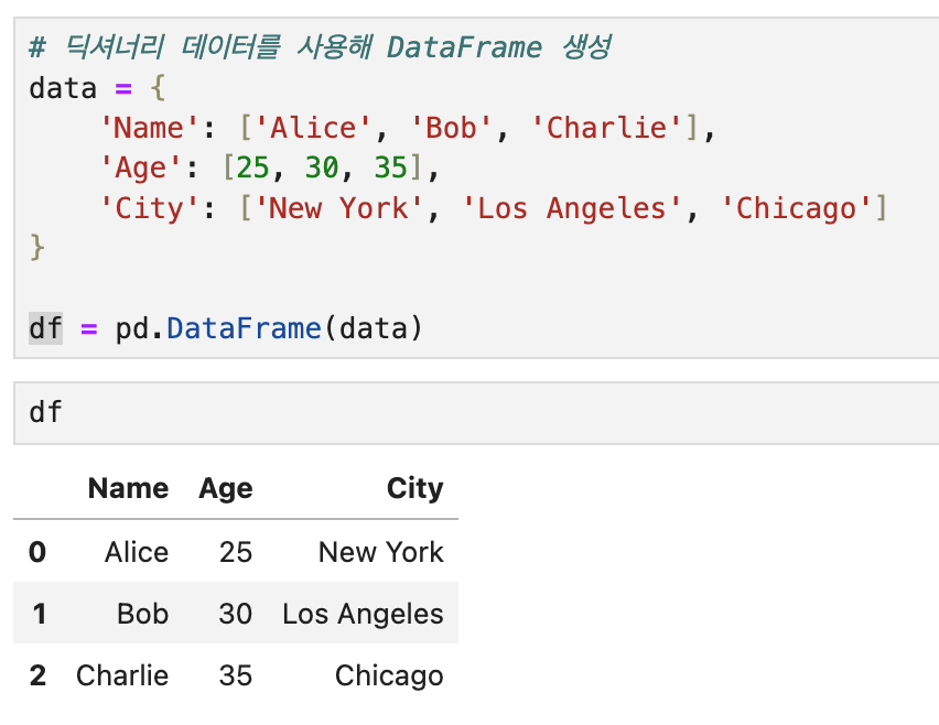 직접 DataFrame()메서드로 딕셔너리와 리스트를 사용하여 생성할 수도 있습니다.