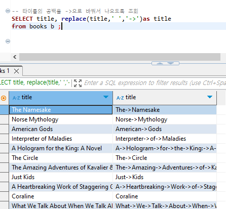 -- 타이틀의 공백을 ->으로 바꿔서 나오도록 조회