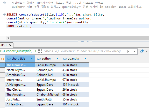 author는 이름 두개 컬럼을 합치고, quantitiy는 원래 숫자에 in stock이 붙도록 조회하세요.