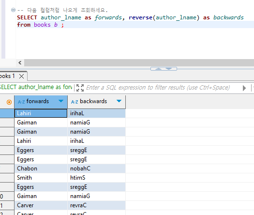 SELECT author_lname as forwards, reverse(author_lname) as backwards