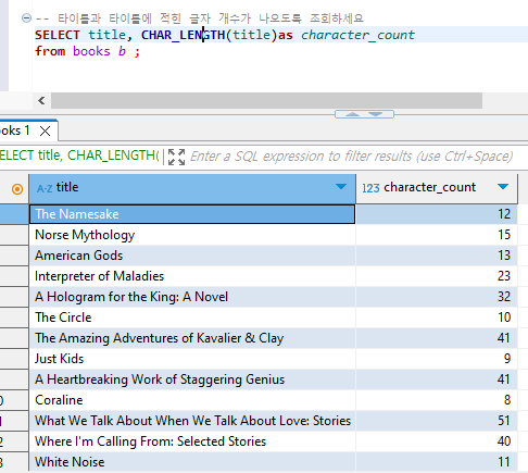 -- 타이틀과 타이틀에 적힌 글자 개수가 나오도록 조회하세요.