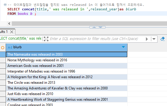 -- 타이트컬럼과 년도컬럼을 합치되 was released in 이 들어가도록 합쳐서 조회하세요.