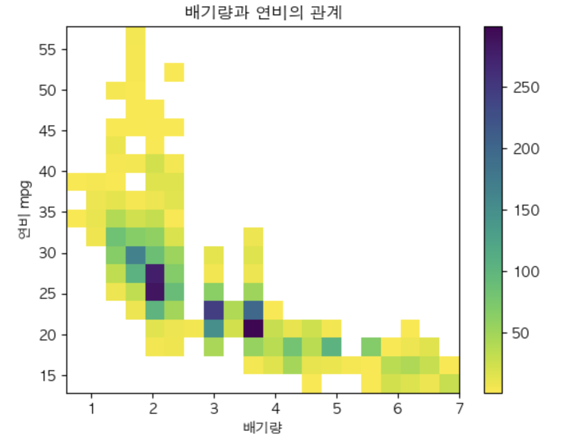 2D 히스토그램은 두 변수의 데이터 분포를 색상으로 나타냅니다. 데이터가 밀집된 구간을 확인할 때 유용합니다.