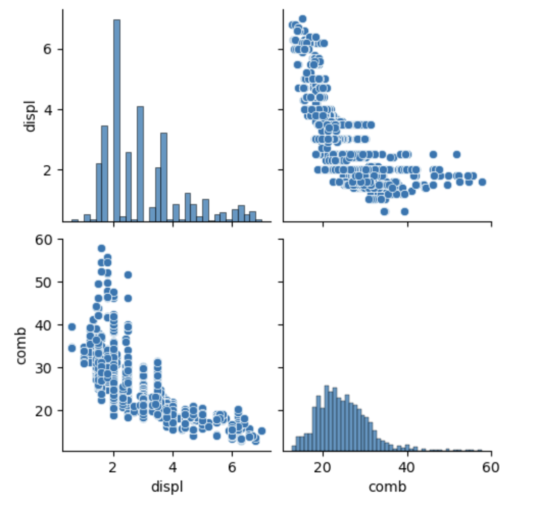 sb.pairplot(data=df, vars=['displ', 'comb'])