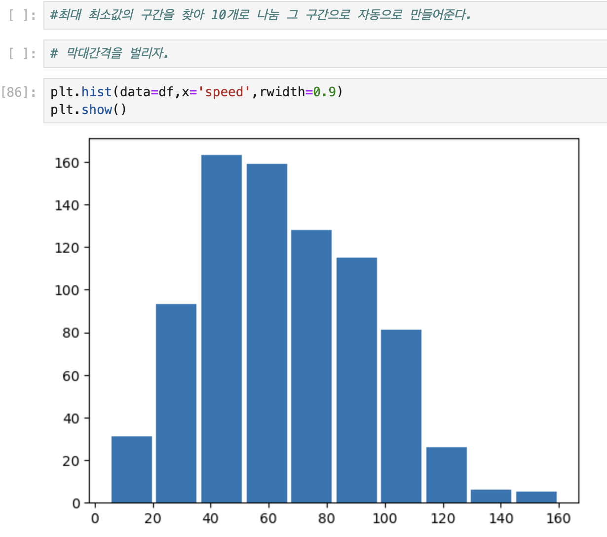 - 구간 설정의 영향: 구간(bin)의 수와 크기에 따라 히스토그램의 모양이 달라질 수 있어 해석에 주의가 필요합니다.