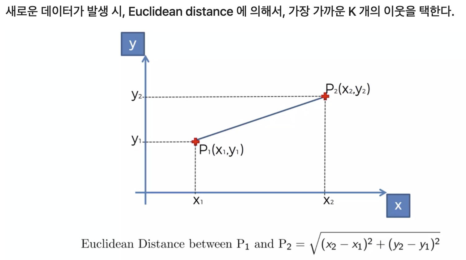 1️⃣ 거리 측정: 새로운 데이터와 기존 데이터 간의 거리를 계산합니다. (유클리드 거리 등 활용)