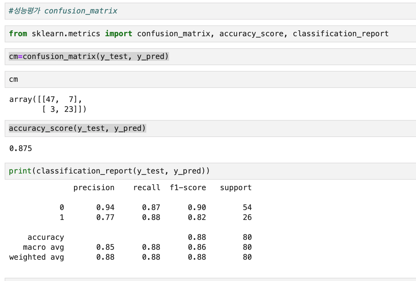 classification_report(y_test, y_pred)를 사용하면 정밀도(Precision), 재현율(Recall), F1-score를 한 번에 확인할 수 있습니다.
