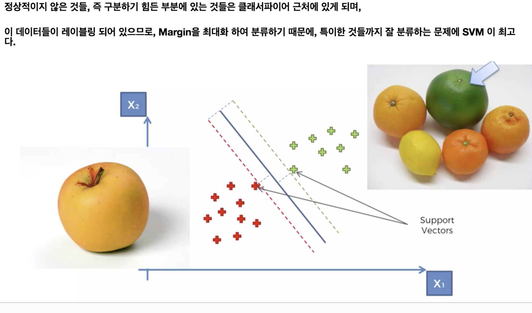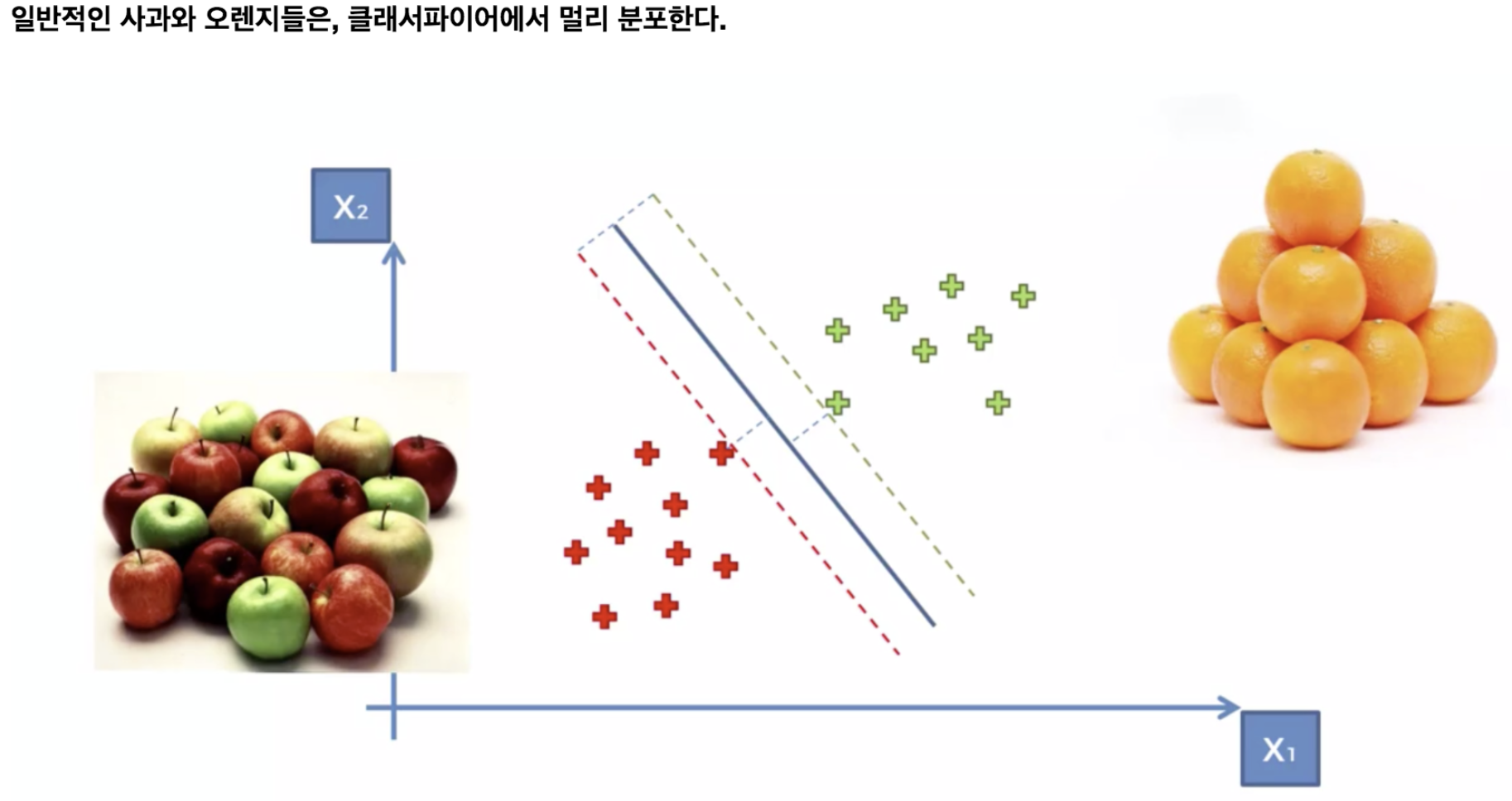 - SVM은 가장 가까운 사과와 오렌지 데이터 포인트(서포트 벡터)를 이용해 최대 마진을 가지는 선을 찾아 최적의 분류를 수행합니다.