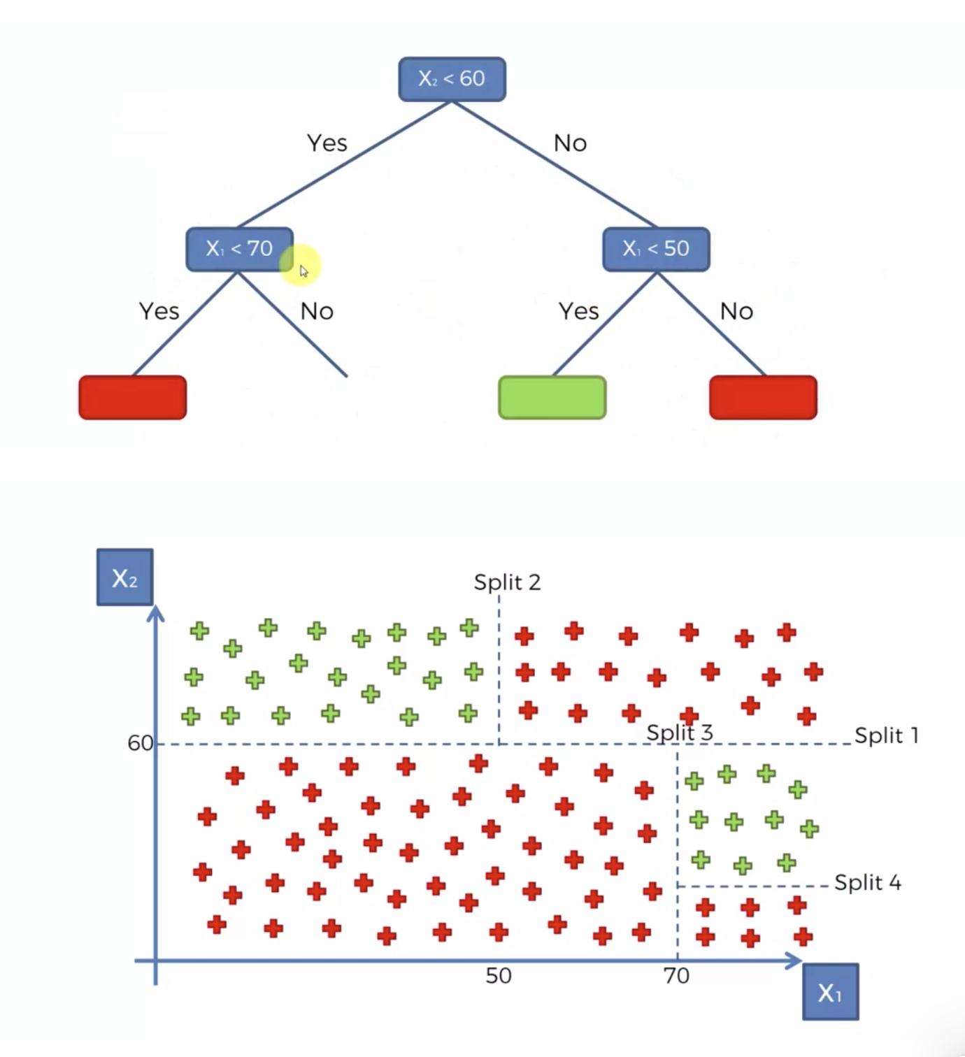 - 각 분기에서 데이터를 나눌 때 정보의 순도를 최대한 높이는 방향으로 결정됩니다. 대표적으로 엔트로피(Entropy)와 지니 계수(Gini Index)를 사용합니다.