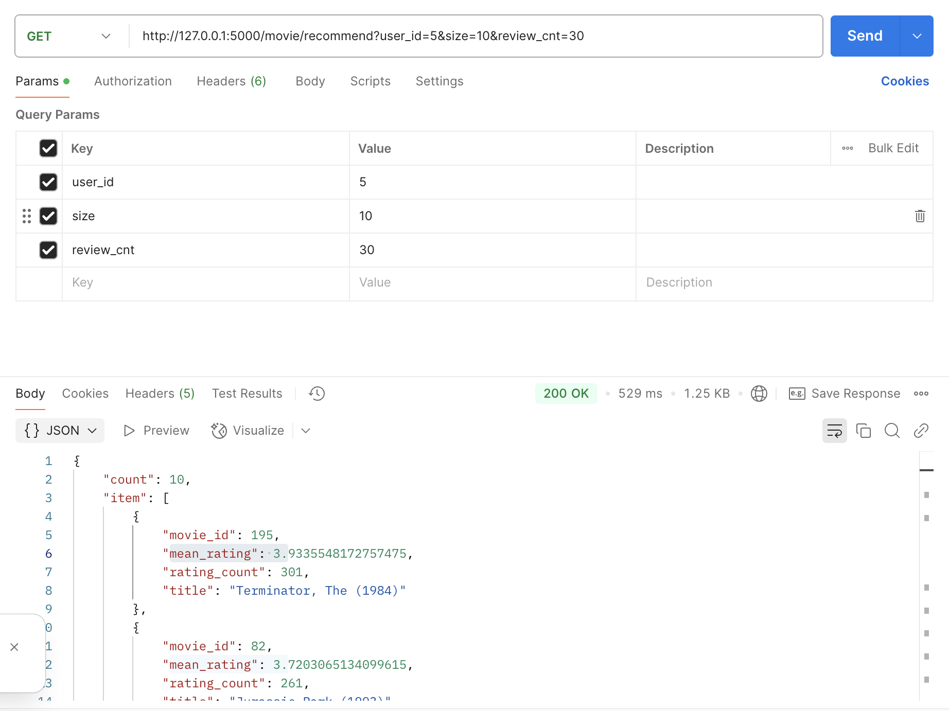 사용자가 GET 요청을 보낼 때, (movie/recommend?user_id=4&size=10&review_cnt=30)