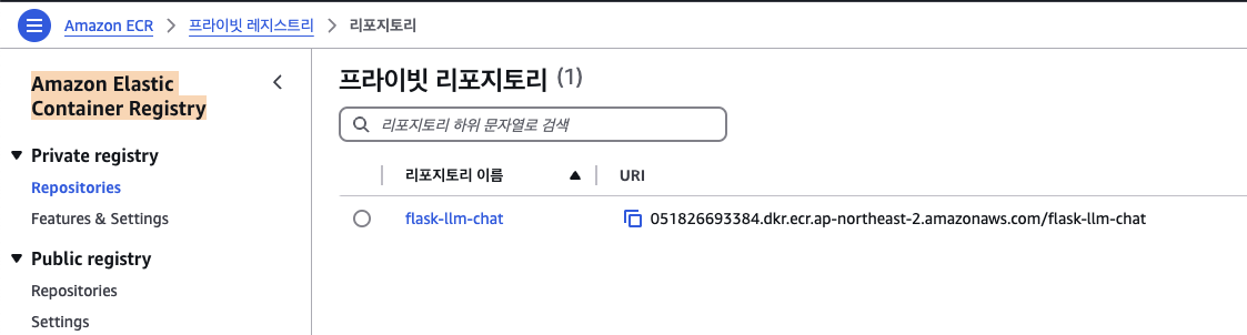 Amazon Elastic Container Registry (ECR)메뉴에서 컨테이너 확인가능