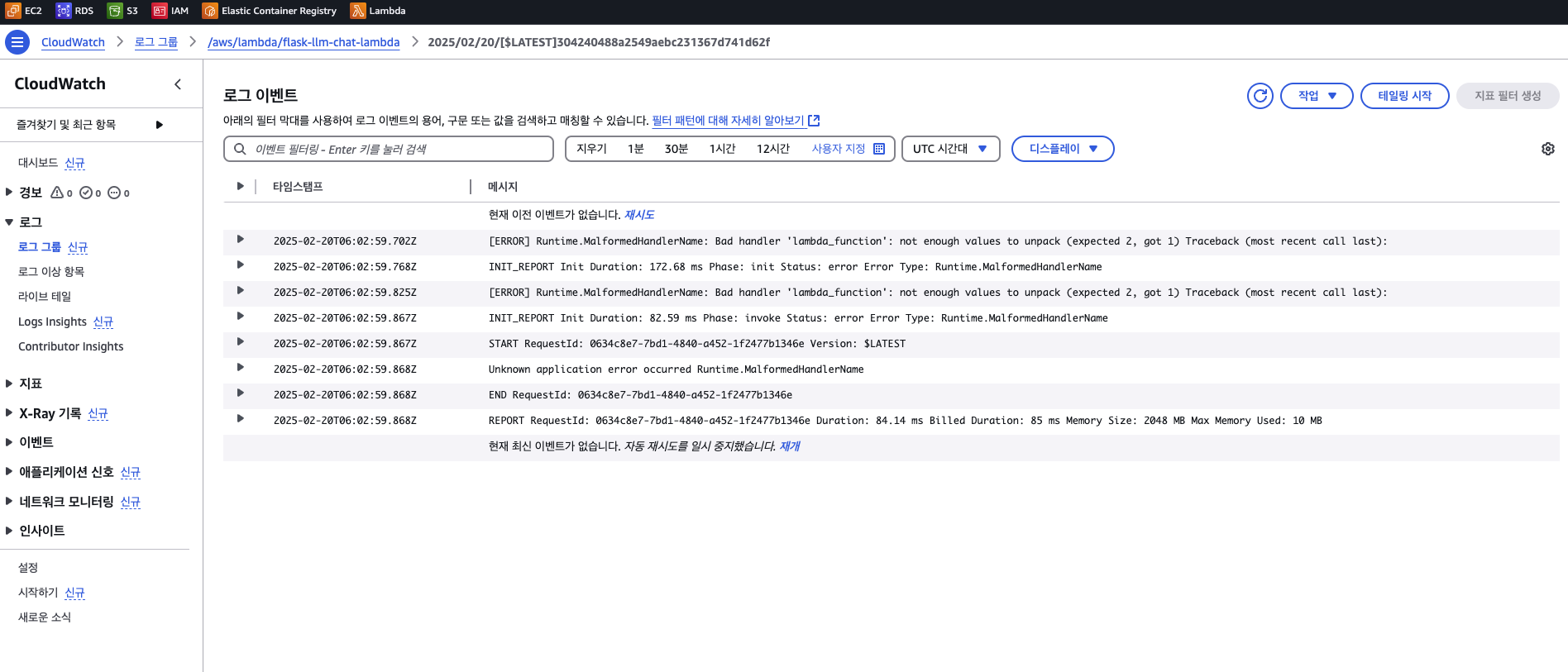 - Lambda에서 에러가 발생하면, AWS Lambda 콘솔 > 모니터링 탭에서 로그 확인