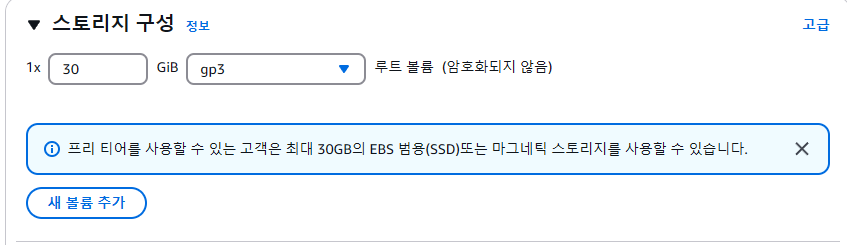 스토리지구성은 30gib (프리티어 최대 사용가능용량)선택