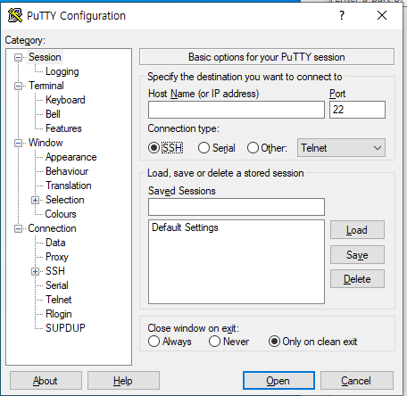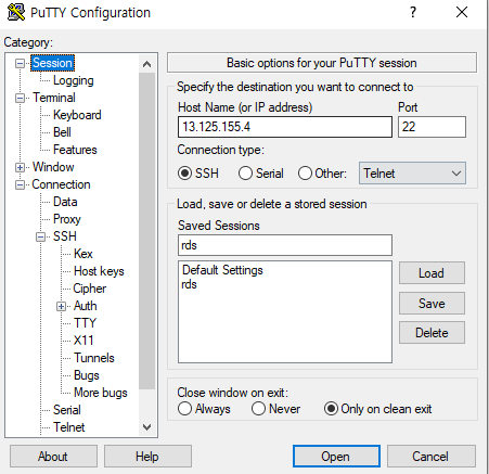 포트는 22로 설정 Host name은 AES의 EC2 IPv4 주소를 입력합니다.