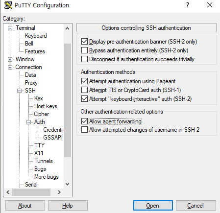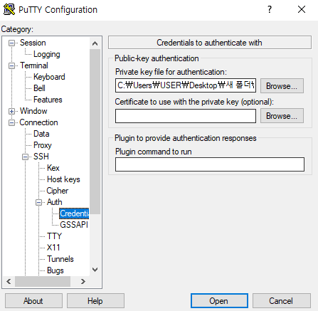 Connection > SSH > Auth > Credenitials에서 EC2인스턴스의 키페어 선택