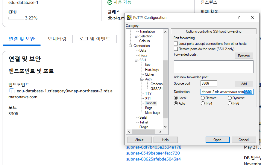SSH > Tunnels 에서 AWS 콘솔의 Desitnation(엔드포인트 :3306)와 포트(3306) 입력