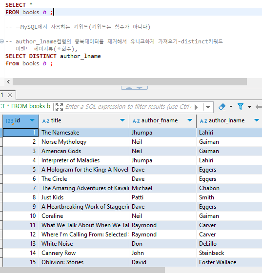 작가 이름을 중복값없이 확인하는 Distinct 키워드