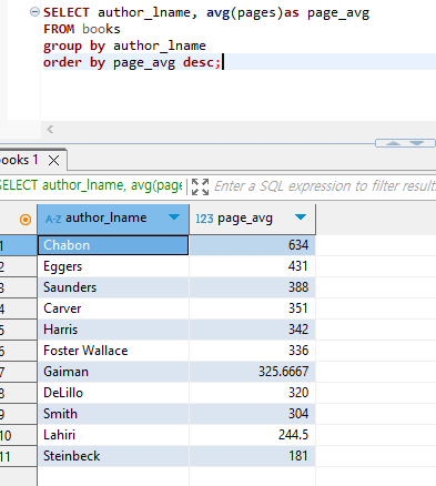 SELECT author_lname, avg(pages)as page_avg