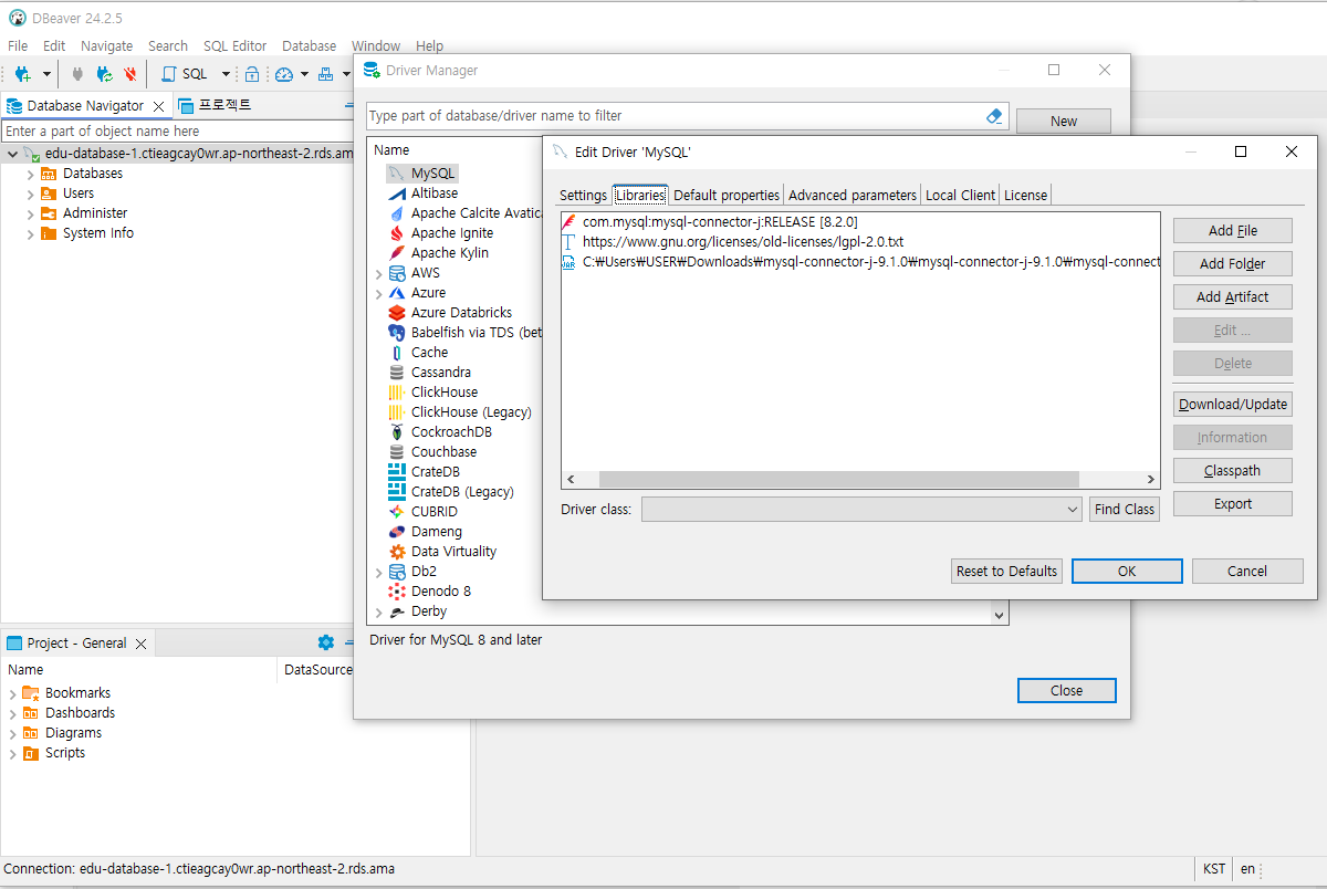 MySQL Connector/J mysql-connector-j-8.2.0 드라이버 오류시