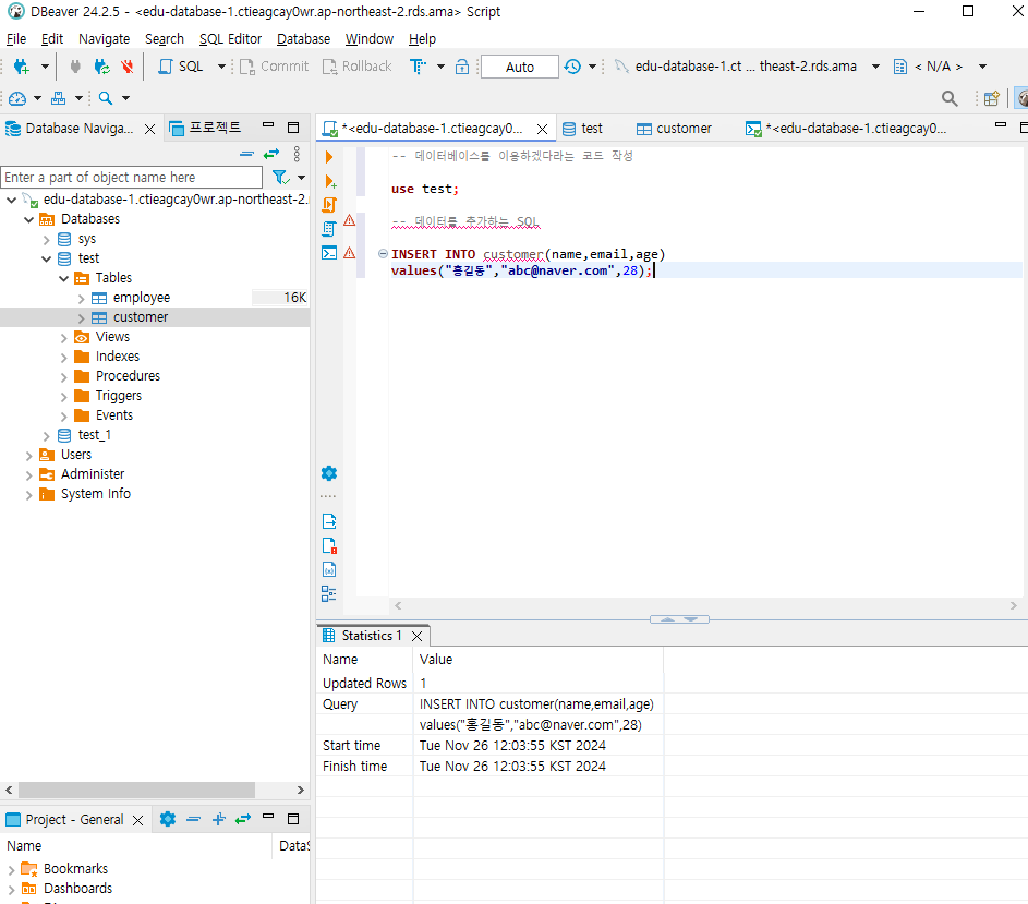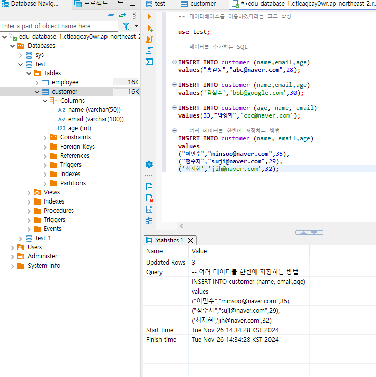 INSERT INTO customer(name, email, age) values("홍길동",'abc@naver.com',28);