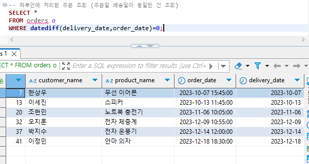 -- 하루안에 처리된 주문 조회 (주문일 배송일이 동일한 건 조회)