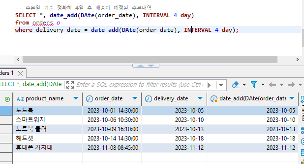 where delivery_date = date_add(DAte(order_date), INTERVAL 4 day);