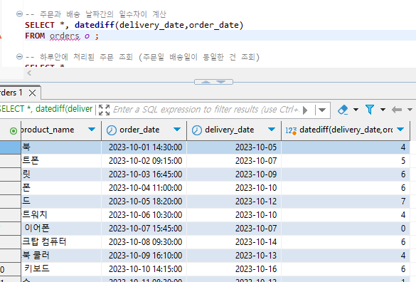 -- 주문과 배송 날짜간의 일수차이 계산