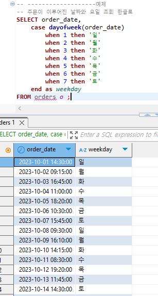 -- 주문이 이루어진 날짜와 요일 조회 한글로