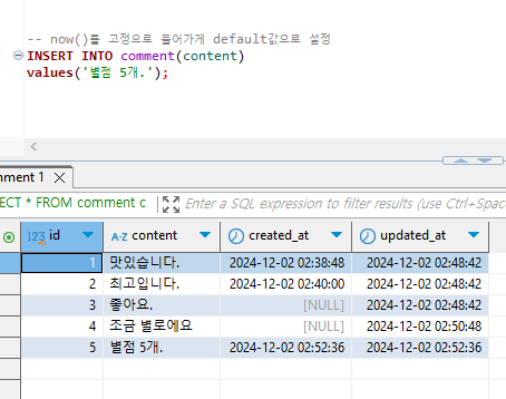 리뷰작성시간 - 데이터 입력되었을때의 시간이 기록되게 now()를 쓰면 되겠구나
