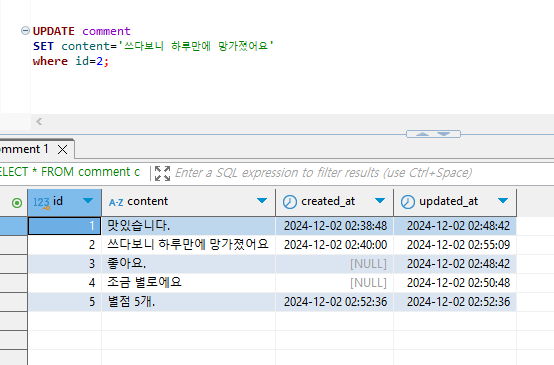 update set 키워드 사용시 updated_at 데이터에 수정 시간이 함께 업데이트 됩니다.